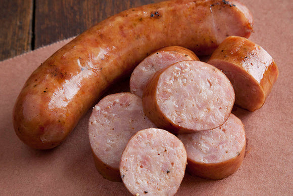 Our Texas Garlic Sausage is made from heritage pork, garlic, sherry, and some secret stuff. Its amazing smoked over oak and cherry woods but also great on the grill and in soups.